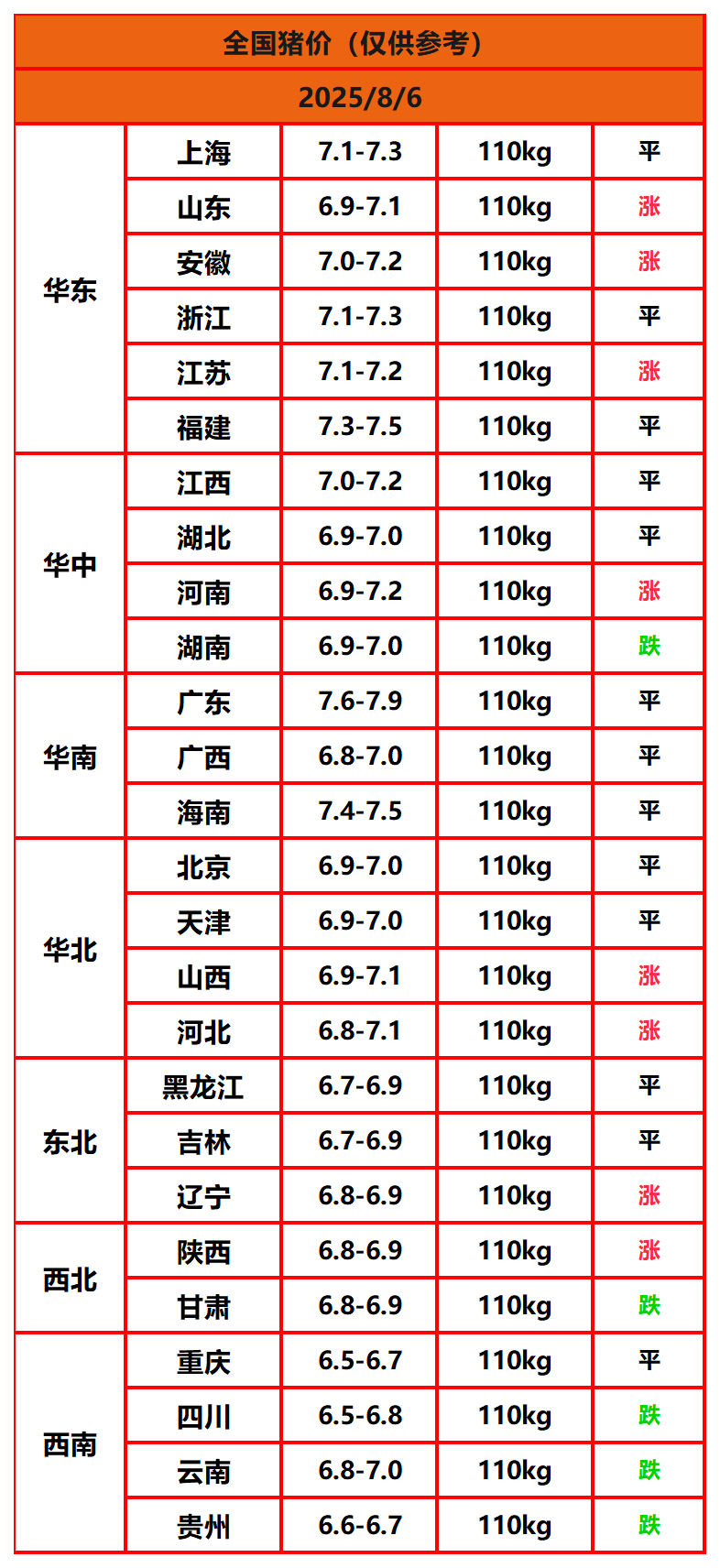 2025年8月6日猪价,今日全国猪价行情走势:8涨5平13跌。