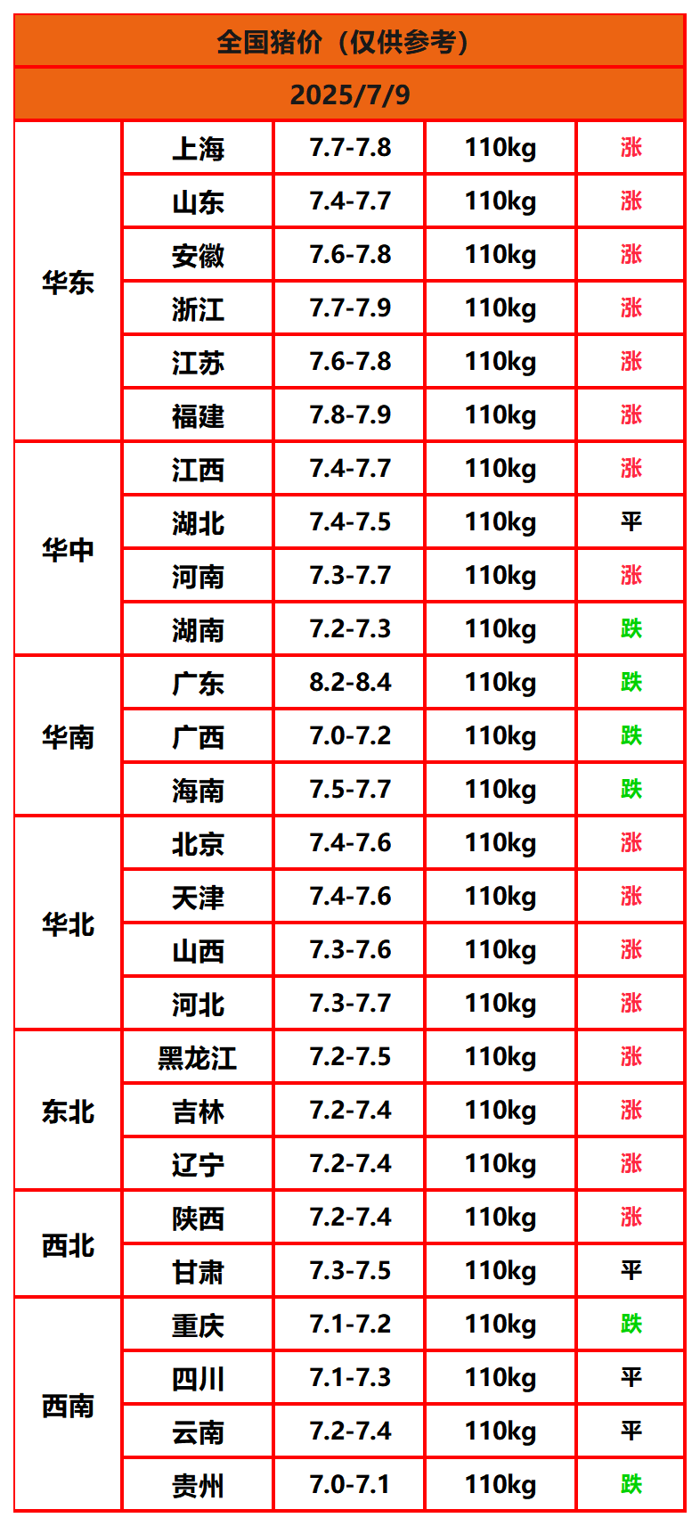 2025年7月9日猪价,今日全国猪价行情走势:16涨4平6跌。
